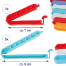 LIEFERUMFANG - 3x Frischhalteklammern / Kunststoffklammern mit 9cm Länge in den Farben Türkis, Weiß und Rot und 7x mit 7cm Länge in den Farben Rot, Blau, Weiß, Türkis und Orange